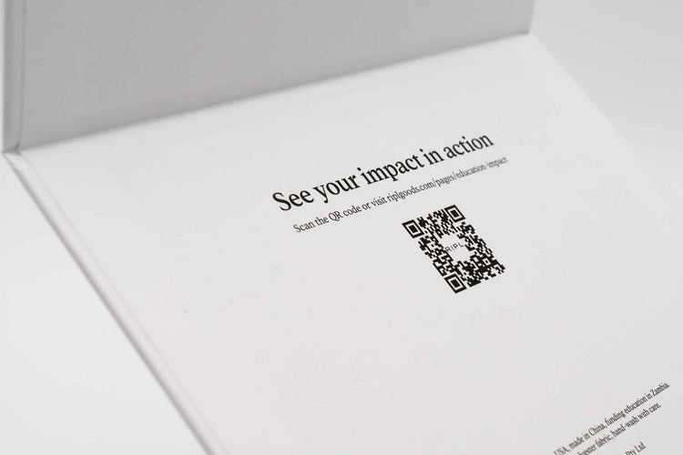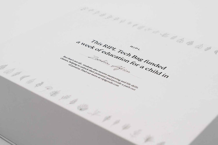 Every RIPL Tech Bag comes in a premium gift box with magnetic closer. The outside tells the impact story and the inside features a QR code where the recipient can track their impact, making it a beautiful gift with purpose.